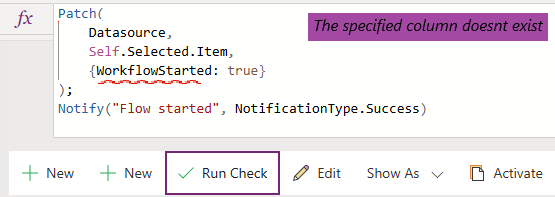 I’m working on a custom button in the command bar in a Model Driven app. I want it to trigger my flow, so I’m doing a Patch to a new column Workflow started. Seems easy enough.